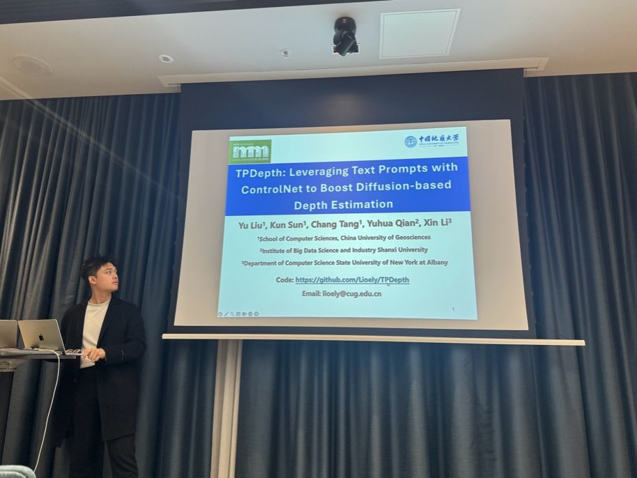 智能科学与技术系孙琨老师指导的硕士研究生刘昱同学参加本次会议并口头宣读了他的论文《TPDepth: Leveraging Text Prompts with ControlNet to Boost Diffusion-based Depth Estimation》。
