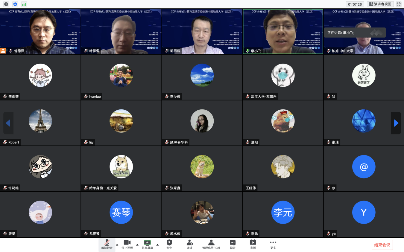 “CCF分布式计算与系统专委走进高校系列报告会”第1期——走进中国地质大学(武汉)于 2020 年7 月 25日在线成功举办。该活动由中国计算机学会主办,CCF会分布式计算与系统专业委员会、米乐M6体育app下载手机版 、智能地学信息处理湖北省重点实验室承办。分布式计算与系统专委会委员国防科技大学郭得科教授、南京大学叶保留教授、中山大学陈旭教授应邀作学术报告,中国地质大学(武汉)曾德泽教授主持会议。会议采用线上腾讯会议和 B 站会议直播的方式,下午参加腾讯会议的人气峰值达175,观看直播的人气峰值达300余人,累计参会人数近500人。参会人员来自包括中国地质大学(武汉)、南京大学、中山大学、国防科技大学、华中科技大学、武汉大学、南开大学、武汉理工大学、中南财政政法大学、华中师范大学、武汉工程大学、湖北大学、西南大学、南京邮电大学、南京理工大学等多所高校。