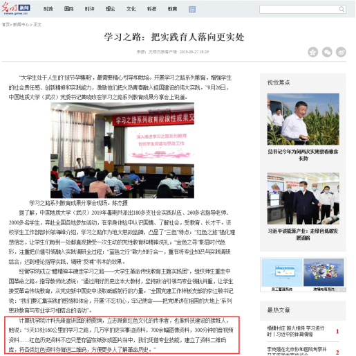 M6体育 党委为推进新时代学生党建,落实“七个有力”实践探索,于2019年成立“计科先锋”,团队成员主要从本硕博各年级学生党员干部中选拔,综合素质较高。自2019年起,为深入贯彻习近平新时代中国特色社会主义思想,“计科先锋”团队连续三年进行暑期社会实践活动,其成果先后被光明日报、中国青年网、湖北高校思政网等媒体报道。