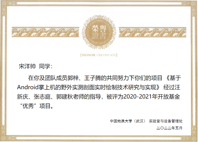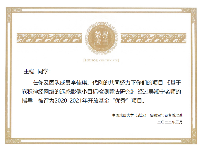 (通讯员:黄燕霞)近日,从实验室与设备管理处获悉,M6体育 在2020-2021学年度教学实验室开放基金项目验收评审中荣获佳绩。张志庭、郭建秋指导的学生团队项目《基于Android掌上机的野外实测剖面实时绘制技术研究与实现》(学生负责人:宋洋帅)、吴湘宁老师指导的项目《基于卷积神经网络的遥感影像小目标检测算法研究》(学生负责人:王稳),在考评中获评优秀,同时M6体育 被评为优秀项目管理单位。