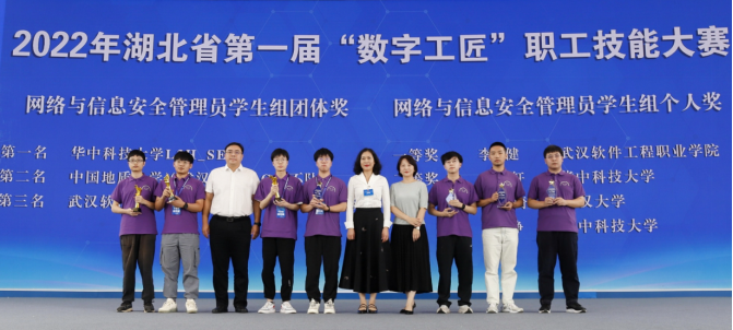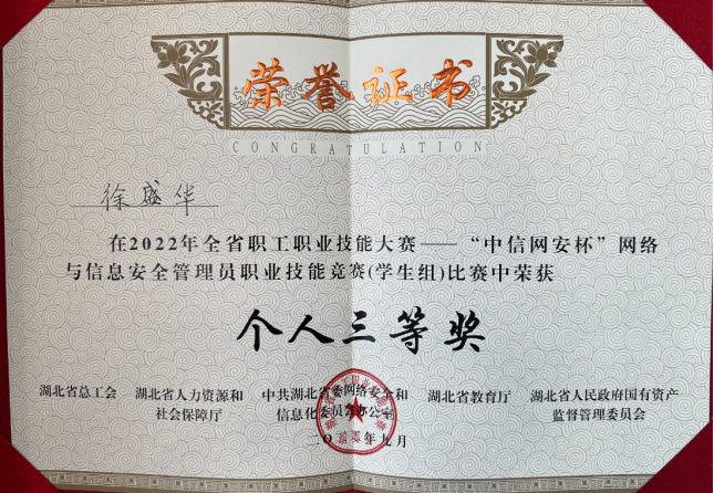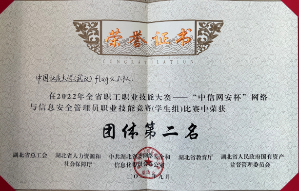 近日,从2022年湖北省第一届“数字工匠”技能大赛暨“中信网安杯”网络与信息安全管理员职业技能竞赛组委会获悉,由M6体育 信息安全系朱静老师指导的“Flag又不队”战队(队员:覃程伟、孙升阳、张涛)以总分第二名的成绩荣获团体攻防对抗赛学生组二等奖,由马钊老师指导的“Flag对不队”成员徐盛华以总分第六名的成绩斩获个人综合靶场赛学生组三等奖。