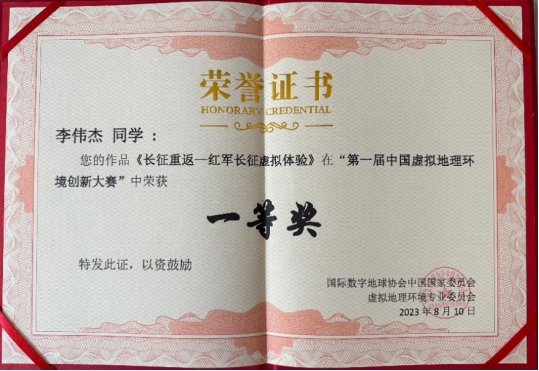 本次竞赛从2023年2月开始到作品提交结束,整个过程历时五个月。李伟杰等五名同学在邱芹军、刘郑和陶留锋三名老师的指导下,查阅了虚拟地理环境的文献资料,师生讨论确实赛道与选题并定期组织会议完成进度,对作品进行反复修改与完善,认真撰写项目实施方案,最终提交了出色的作品,通过专家初审评阅和现场汇报等环节的严格筛选,他们最终脱颖而出,荣获一等奖。他们的杰出表现展现了M6体育 学子的才华,彰显了M6体育 学子在学术和团队合作方面的卓越素养。
