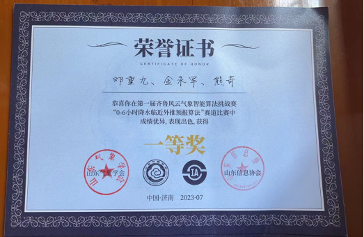 7月15至16日,由山东气象学会、浪潮数字(山东)建设运营有限公司、山东信息协会联合主办的第一届齐鲁风云气象智能算法挑战赛决赛及颁奖仪式在济南完美收官。历经初赛、复赛、决赛的层层选拔和激烈角逐,M6体育 教师刘佳指导的研究生邓重九、金永军、熊奇组成的团队获得“0-6小时降水临近外推预报算法”赛道一等奖。