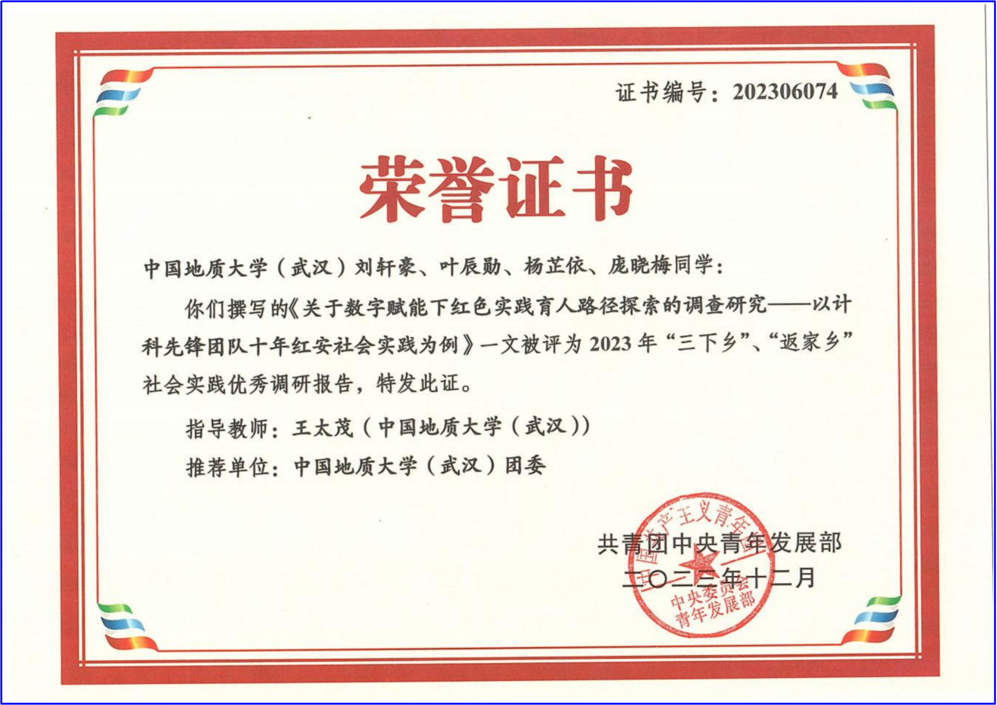近日,共青团中央青年发展部公布2023年度“三下乡”、“返家乡”社会实践优秀调研报告拟入围名单。在M6体育 王太茂老师指导下,刘轩豪、叶辰勋、杨芷依、庞晓梅同学的实践调研报告《关于数字赋能下红色实践育人路径探索的调查研究——以计科先锋团队十年红安实践为例》成功入围。