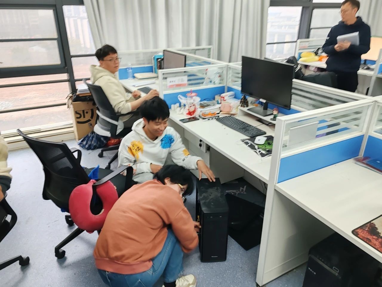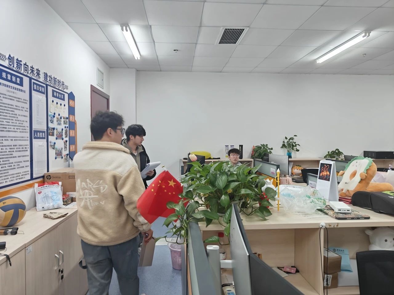 实验室的文化墙见证了学生们在导学团队中的成长与蜕变。这些生动的照片不仅展示了他们的精神风貌,还传递了一种积极向上的力量。在走访过程中,吴湘宁老师还碰到了同学们积极参与实验室器材的维护工作。他们认真检查机器的运行状况,及时排除故障,确保科研工作能够顺利进行。