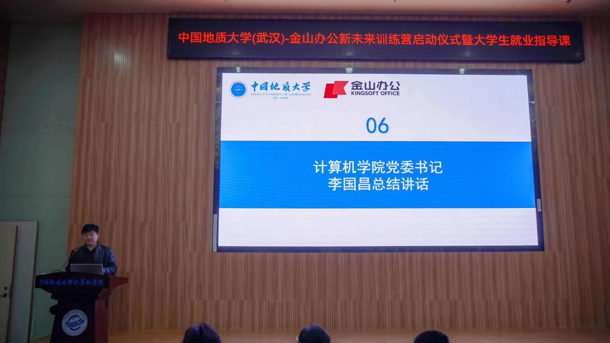 杨钢致辞。他表示金山办公非常注重技术和人才培养,致力于把互联网前沿技术带进高校。去年,两个单位联合申报的就业育人项目获教育部就业育人优秀案例,今年,我们也一如既往的提供高质量的学习资源和学习环境,将前沿的技术和真实的项目案例提供给同学们。期待和地大的合作更上一个台阶,