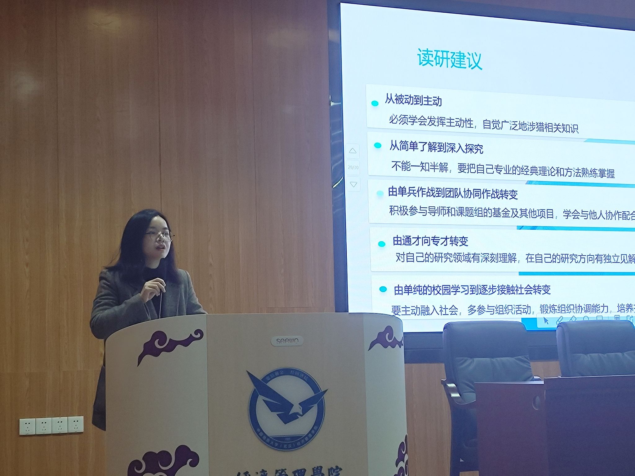 在谈到与导师的关系时,陈漫老师强调了科研心态的重要性。她建议同学们应以自主学习为主,导师的指导为辅,在与导师沟通时,要理解并尊重导师的时间和精力,通过积极沟通来明确双方的期望和目标。她借用市场营销学中的顾客满意度概念,来说明学生期望与感知价值之间的平衡在科研关系中的重要性。