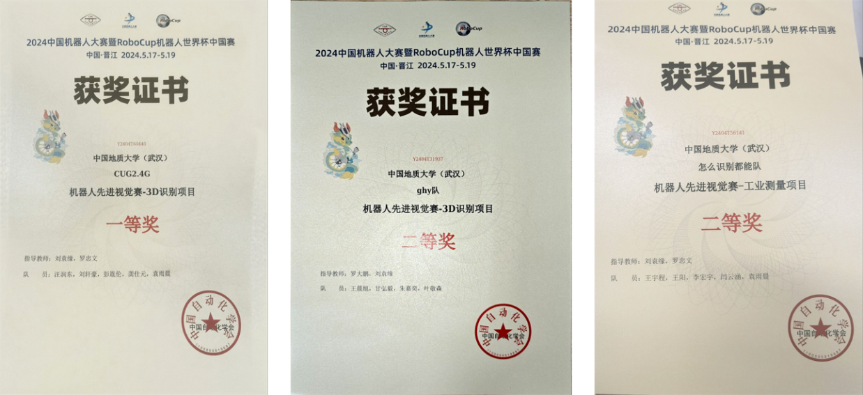 在老师的引领下,三支队伍深入研究,克服困难,紧密合作。他们从数据采集到模型部署,再到算法的反复测试和迭代优化,日夜奋斗,不断进步,他们的努力最终得到了回报。在3D识别赛项中,由M6体育 的汪润东、刘轩豪、彭胤伦、龚仕元组成的CUG2.4G队表现出色,荣获国家一等奖;机械与电子信息M6体育 的王晨旭、甘弘毅、朱嘉奕、叶敬森组成的ghy队荣获国家二等奖。同时,在工业测量赛项中,M6体育 的王宇程、王阳、李宏宇、闫云涵组成的怎么识别都能队展现实力,荣获国家二等奖。
