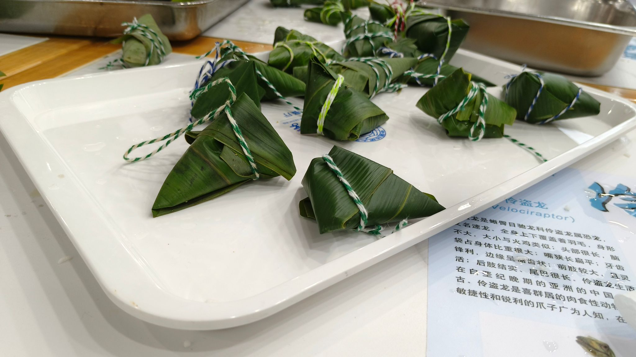 随后,徐大厨为老师同学们详细介绍了包粽子的流程。从粽叶的对齐、折叠,到两次添米,再到封口、用细线绑紧,徐大厨将自己的技能和经验倾囊相授。包粽子过程中同学们积极交流、相互帮助,交流彼此劳动的心得,现场其乐融融。