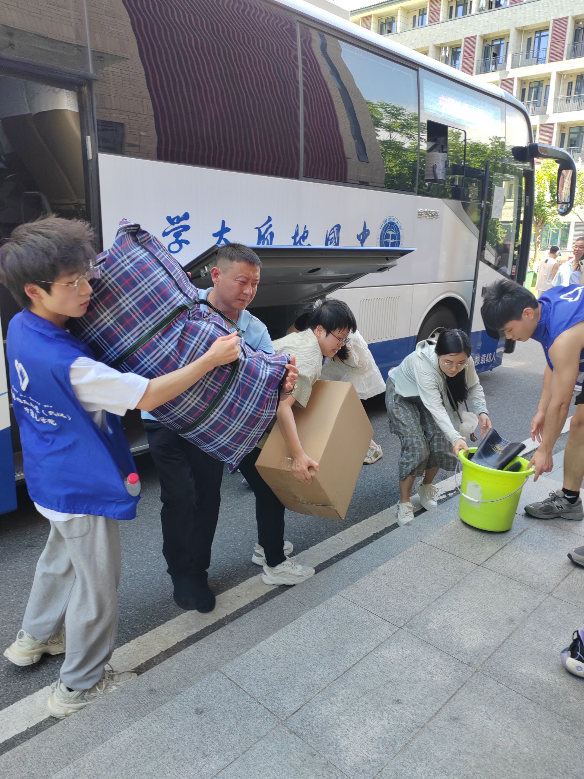 同学们早已打包好行李在楼下等待,随着搬运车辆逐次停下,大家自觉组成流水线相互接力,一件件纸箱、行李箱、储物袋最终被罗列得整整齐齐。尽管天气炎热,但大家的热情不减,许多男生主动帮助女生搬运行李,在各位老师的指挥下,一切都在有条不紊地进行。