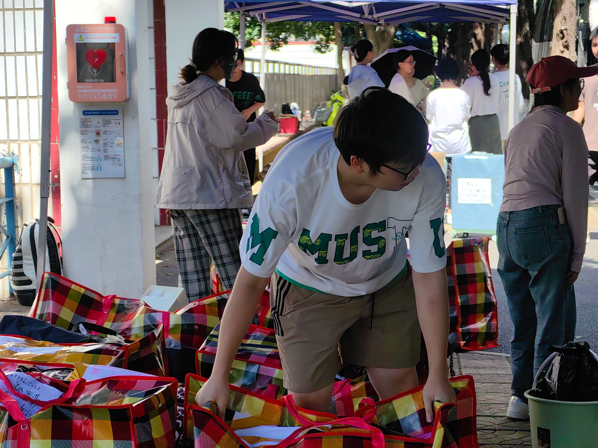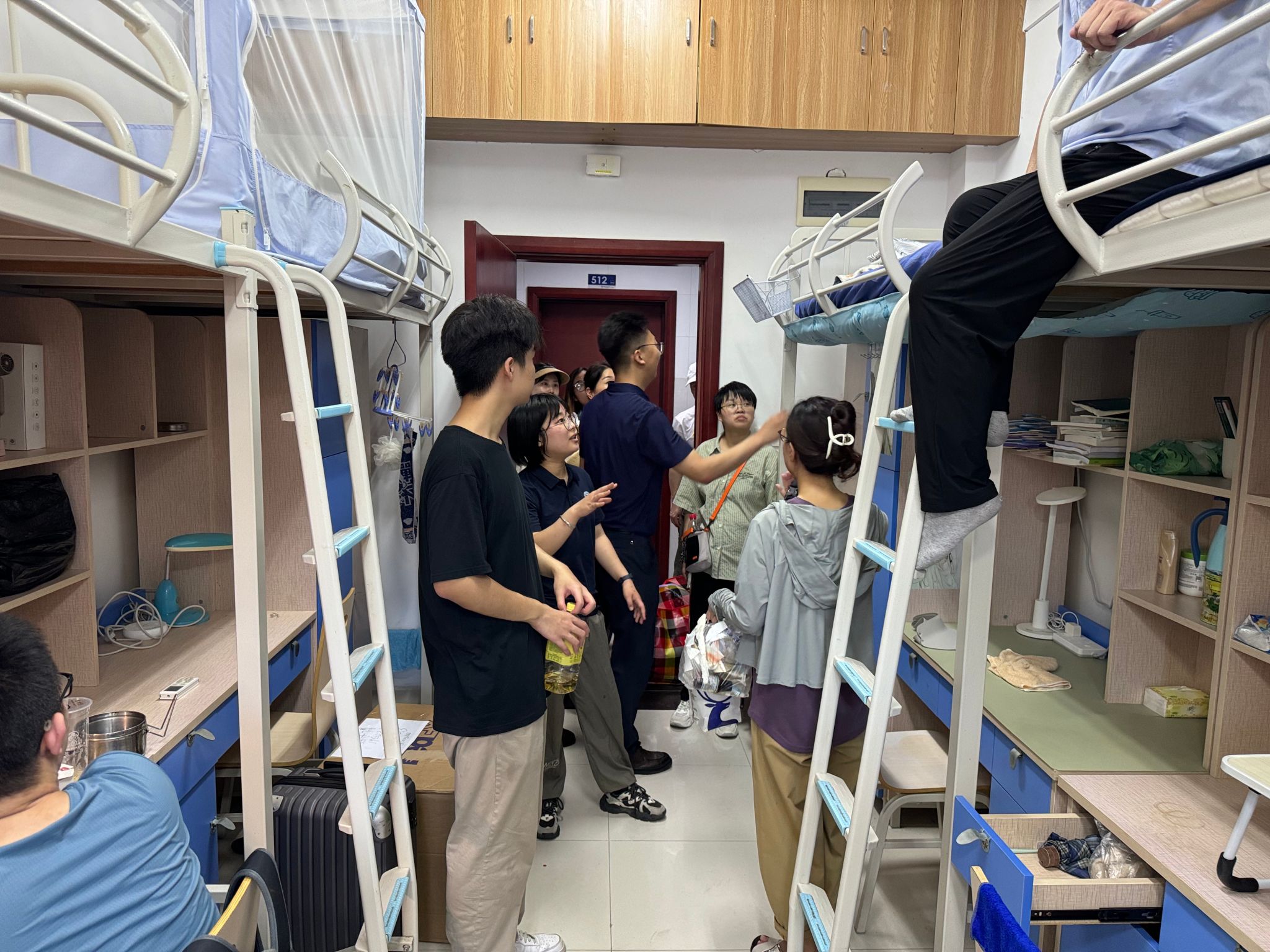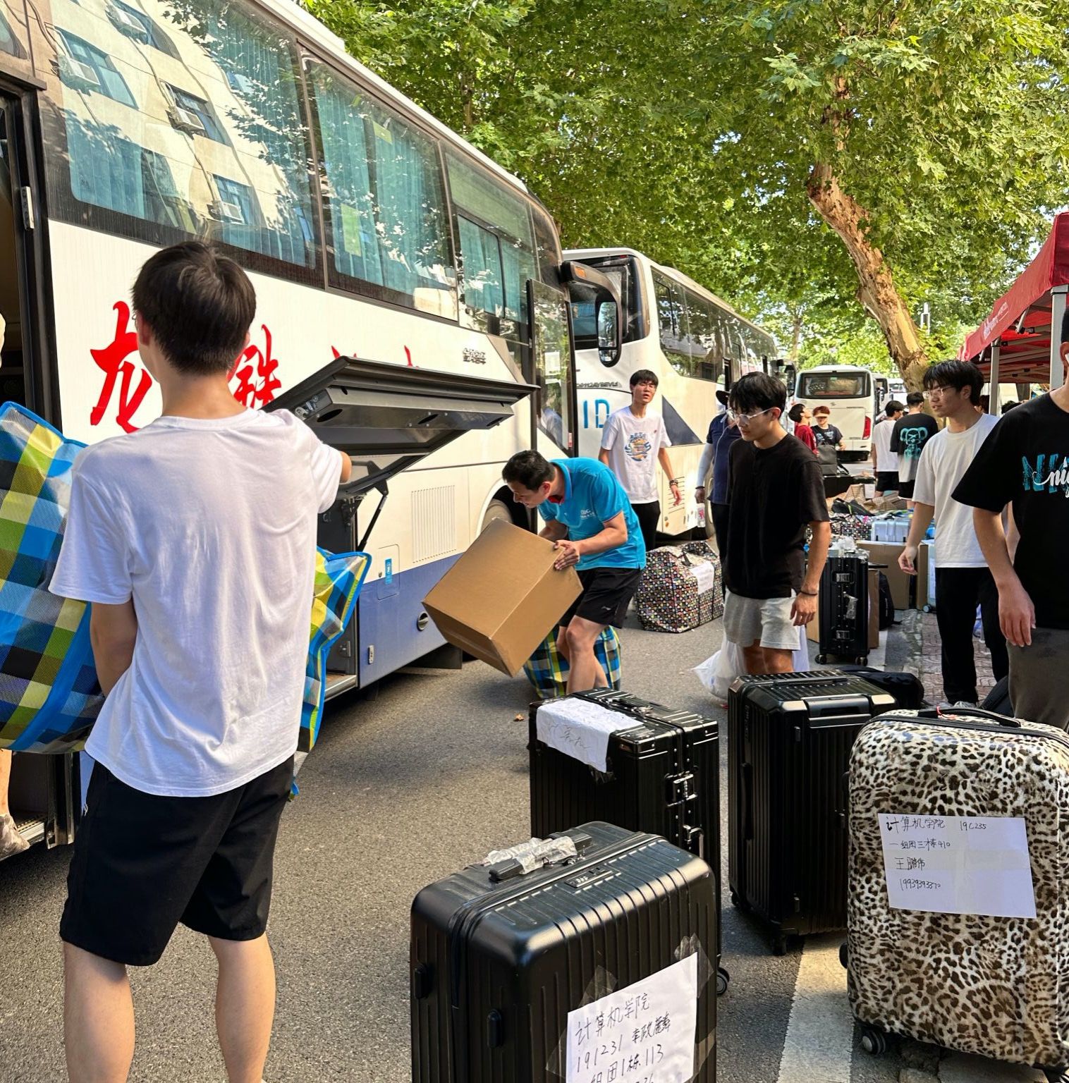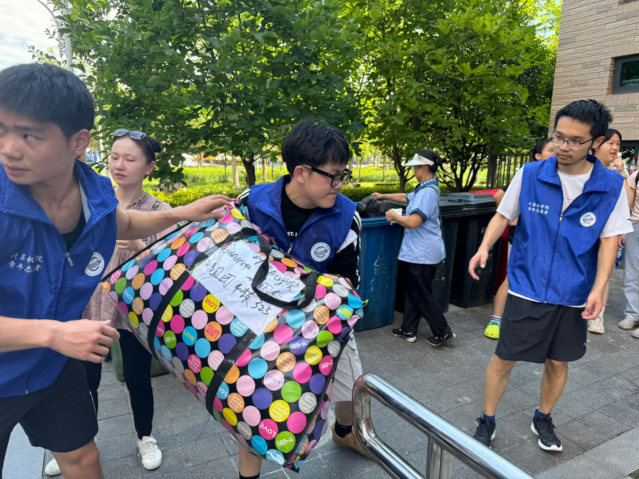 大巴驶入校园,在学生们即将入住的宿舍前,橙色的凉棚早早张开,身着蓝色马甲的志愿者们等候多时。多批运输车辆将学生物品运至宿舍楼下,老师和志愿者为新到来的2023级计科学子搬运行李,指明方向;宿管阿姨分发钥匙,严谨细致地录入信息;同学们彼此合作,将沉重的包裹运到新宿舍,开启一段崭新的未来旅程。