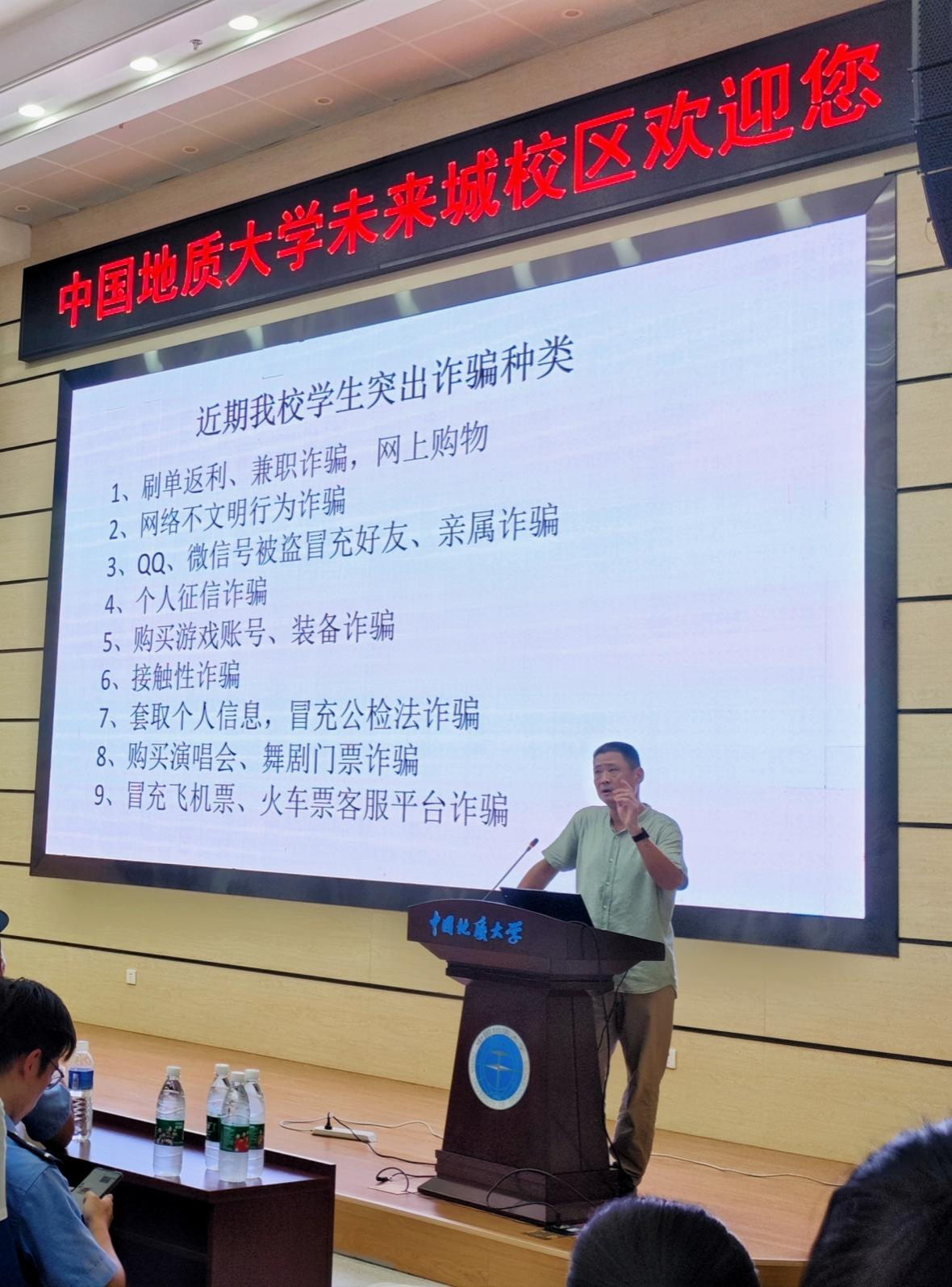 随后,张献文详细阐述了网络诈骗种类,结合相关案例等,深刻揭示了犯罪分子各种层出不穷的诈骗手段,提醒同学们不要随便泄露个人信息,谨慎对待陌生人的请求,从合法渠道购买门票,不轻信可疑人员,越是自以为是越容易上当受骗。同时,强调宿舍防火防盗的重要性,提醒同学们保管好个人财产,出门锁门,正确电器设备,人走断电,严禁使用各类违章电器,以防止火灾事故的发生。