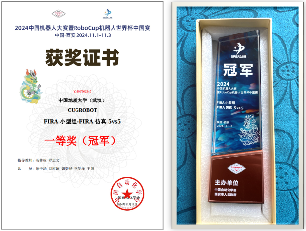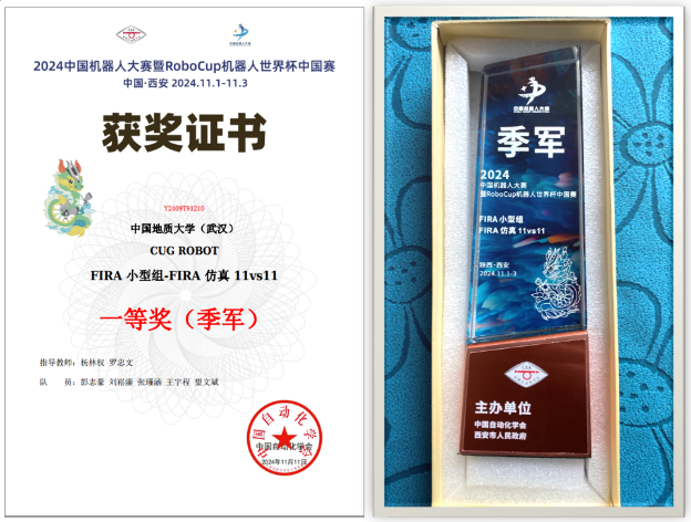 “勤学苦练有路通,勇毅创新无涯行。”为了备战此次比赛,参赛队员们充分利用课余时间,广泛查阅论文资料,理论联系实际,结合具体问题提出创新解决方法,大胆实践,经常加班到凌晨。最终,功夫不负有心人,从单个机器人的运动控制到智能决策,从多机器人路径规划到整个机器人阵型的协同优化,CUG机器人代表队的队员们在杨老师和罗老师的指导下不断攻克难题,勇攀高峰,夺得桂冠。