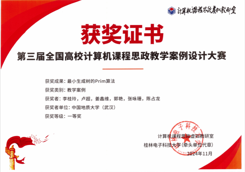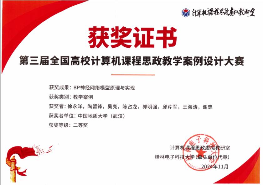 在M6体育 党委的大力支持下,多位教师携其精心设计的教学案例参赛。其中,邱芹军等老师提交的“地质知识图谱的构建及推理应用”、李桂玲等老师提交的“最小生成树的Prim算法”获得一等奖,徐永洋等老师提交的“BP神经网络模型原理与实现”获得二等奖。以上荣誉的获得不仅展示了我校计算机科学与技术领域的教学水平,更体现了我校在人工智能赋能思政教育融入课程教学方面的显著成效。