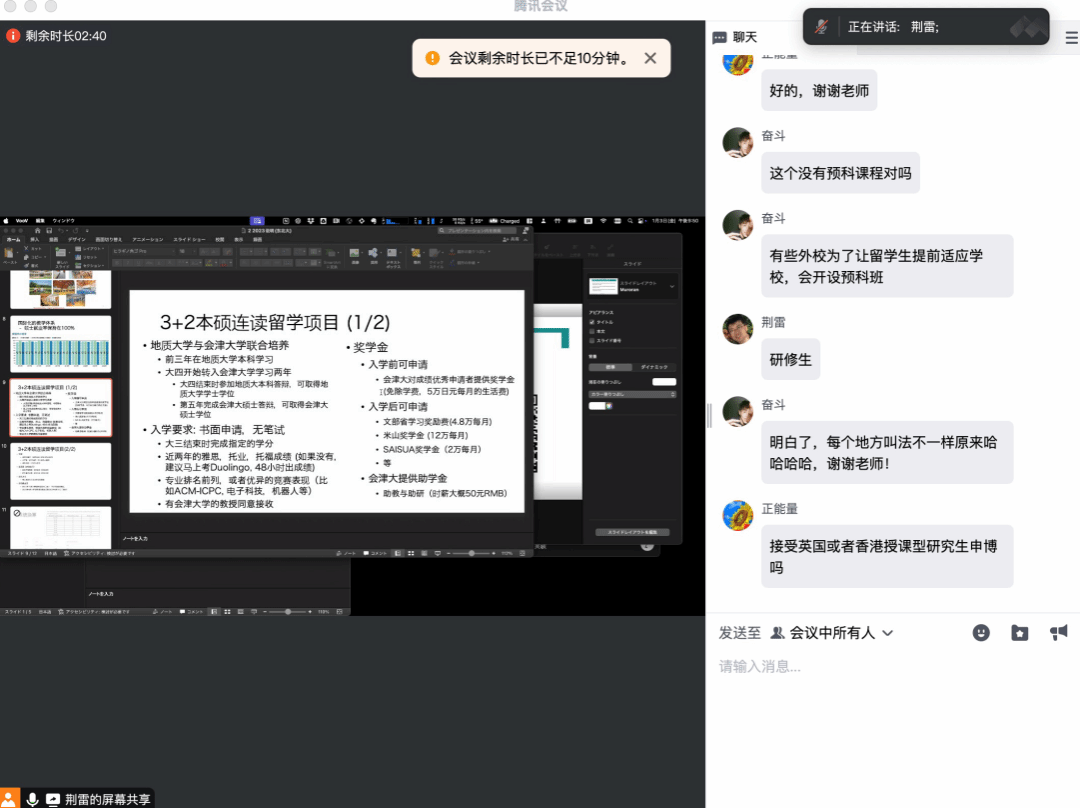 参会同学纷纷进行提问,会津大学荆雷副教授分别对提出的申报要求、流程、毕业去向等问题一一进行回答,并留下联系方式欢迎同学们随时交流。