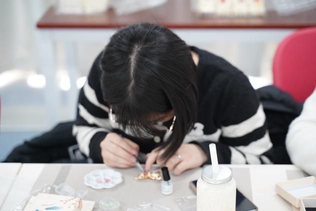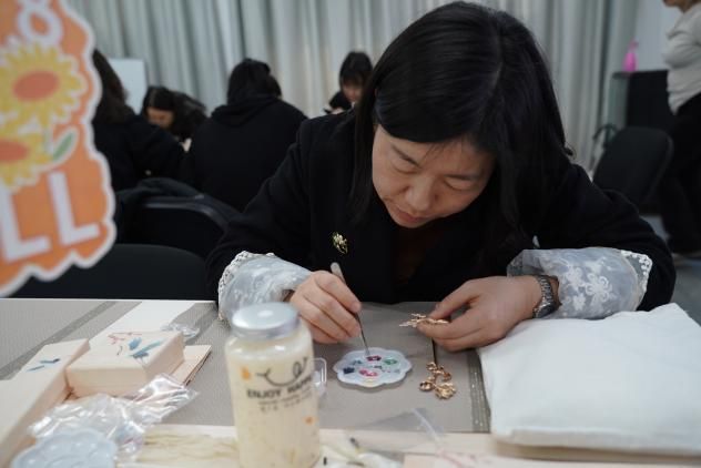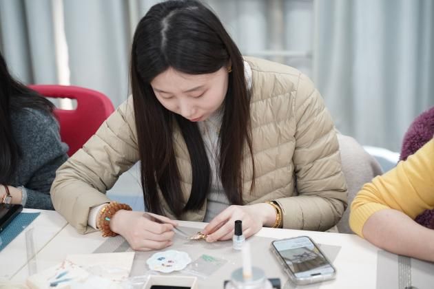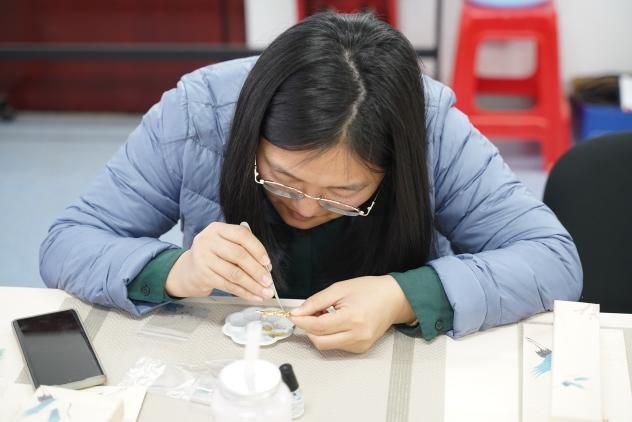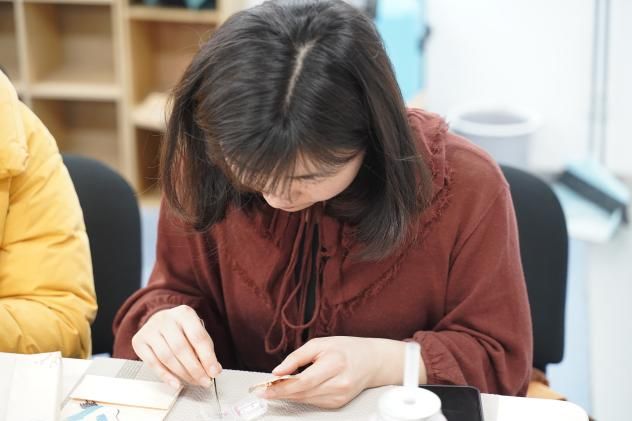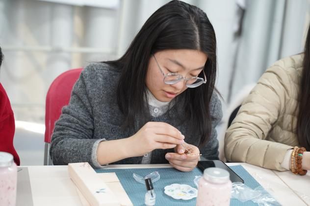 随着非遗手工老师的娓娓道来,螺钿艺术的神秘面纱被缓缓揭开。那细腻的讲解,如同春风化雨,老师们聚精会神,眼眸中闪烁着对传统文化的敬畏与向往。随着手工老师指尖翻飞,珍珠母贝薄片顿时在发簪上星河倾泻。女老师们暂时卸下科研重担,纤指执起蚌贝裁制的蝶翼,在合金簪首上铺陈星汉——青蚨贝化作藤蔓缠绕发簪,夜光螺凝成牡丹绽于胸针,珍珠母贝串起银河般的手链。林小艳老师凝神屏息,镊尖轻旋贝片角度,在智慧树图腾的枝桠间唤醒沉睡的星光,0.2毫米的贝母碎片竟折射出整个银河的辉光。卢笙老师将现代配色融入传统纹样,指尖的螺钿拼贴出灵动翩跹的蝴蝶。