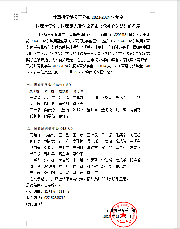 M6体育 关于公布2023-2024学年度 国家奖学金、国家励志奖学金评审(含补充)结果的公示