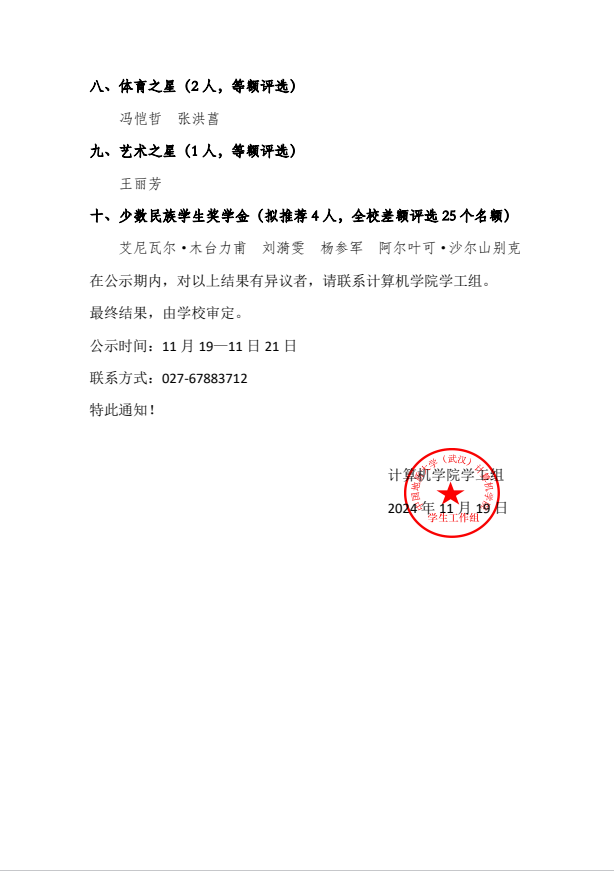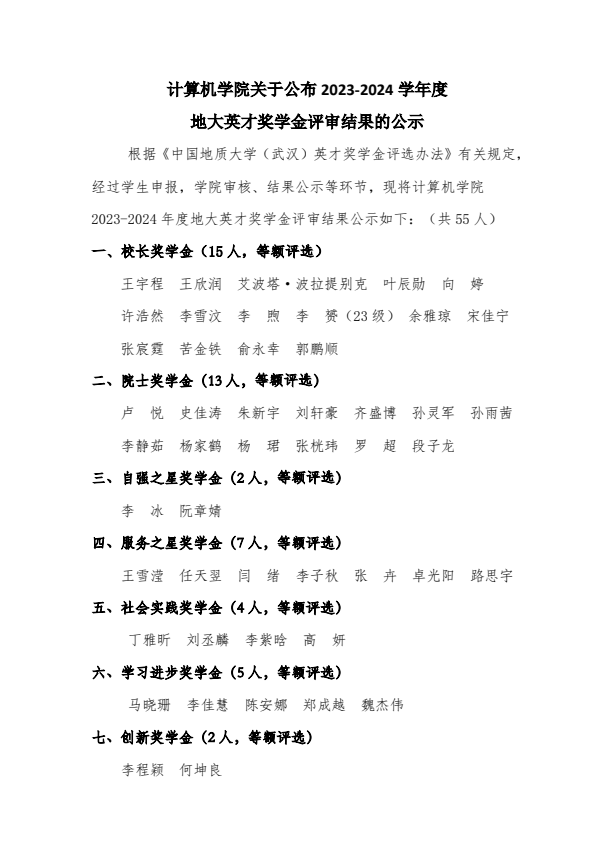 M6体育 关于公布2023-2024学年度地大英才奖学金评审结果的公示