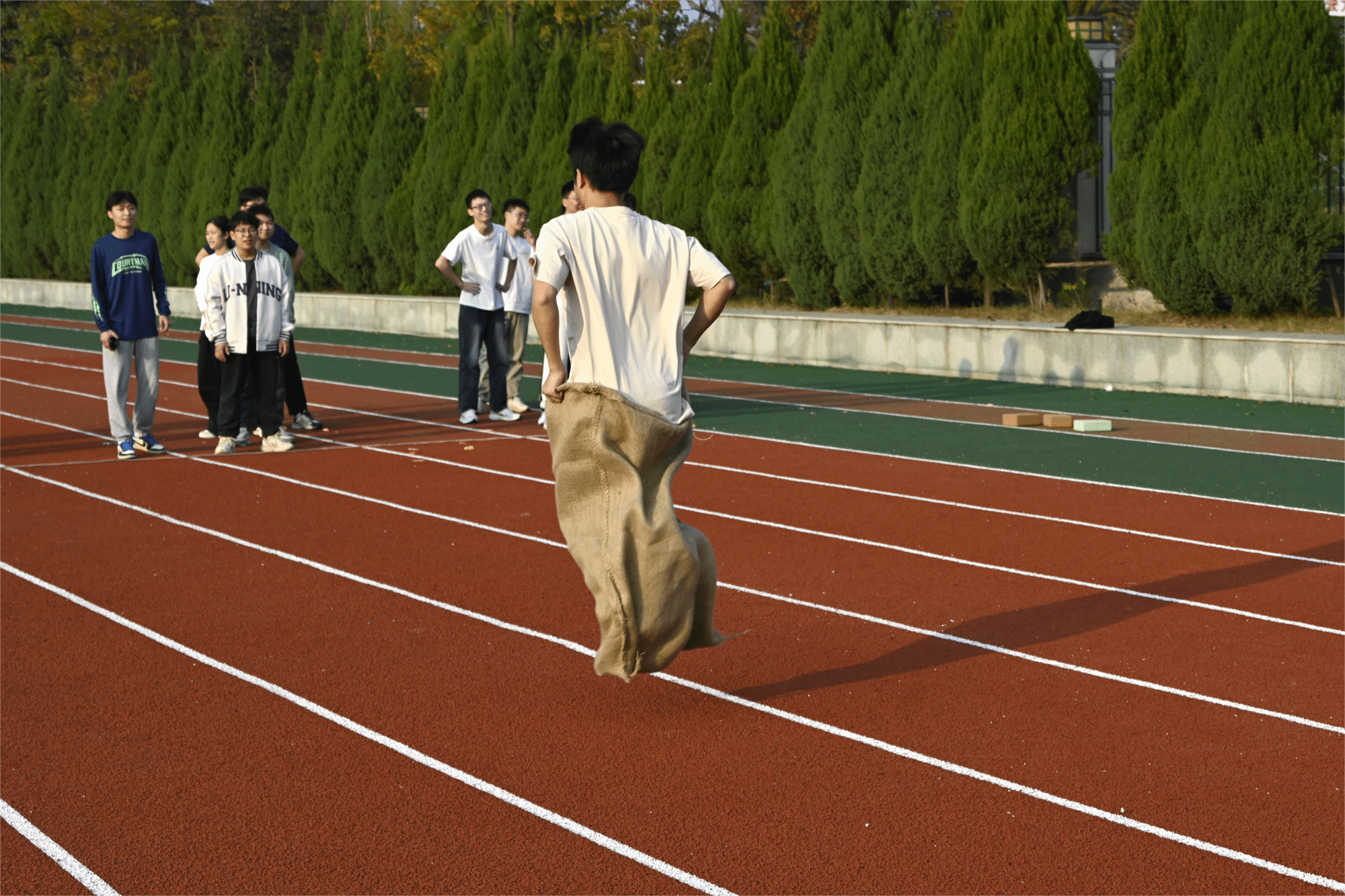 随后进行两项比赛,再次将未来城校区操场上的欢笑与热情推向高潮。跳大绳的同学们脚步轻快、跃动有力,腾空的瞬间充满青春活力;而背靠背夹气球的同学们背靠背紧贴站立,稳稳夹住气球,互相支撑着向前谨慎移动,并在最后冲线的一瞬间挤爆气球,刹那间全场热烈欢呼,气氛和情绪已然到达了顶点。