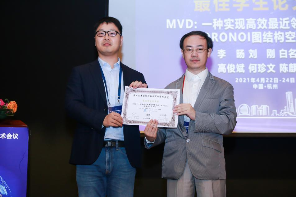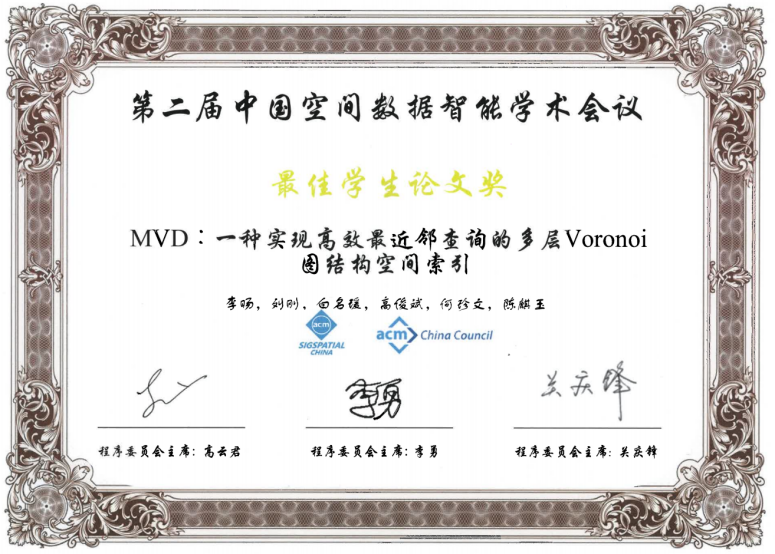 2021年4月24日,为期两天的第二届中国空间数据智能学术会议(SpatialDI 2021)在杭州市浙江宾馆圆满闭幕。以M6体育 博士研究生李旸为第一作者,以刘刚教授为通讯作者的论文《MVD:一种实现高效最近邻查询的多层Voronoi图结构空间索引》荣获会议最佳学生论文奖。该论文针对传统树形索引主要存在的结构失衡和节点重叠问题,提出了一种基于多层Voronoi图结构的空间索引方法,提升了大规模空间数据环境下最近邻查询和k近邻查询的检索效率和I/O性能。