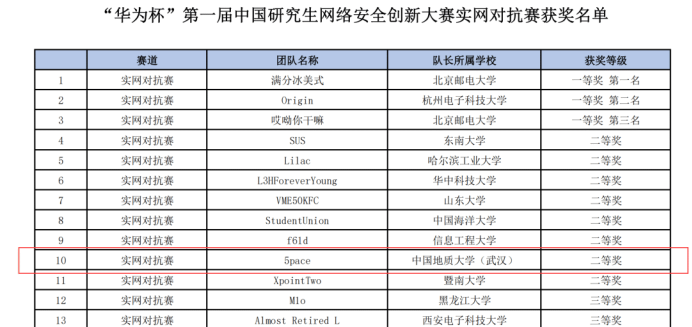 比赛历程:实网对抗赛分为初赛和决赛,初赛于11月19、20日进行,形式是CTF解题赛,在初赛中各个学校的队伍实力都非常强劲,而代表中国地质大学(武汉)的5pace战队是踩着线进入了决赛。决赛于11月26、27日进行,26号是实网对抗,需要进入北邮的内网进行渗透,将成果提交后由裁判打分;27号是awdp模式。26日的渗透成绩当天并未公布,27日5pace战队的成绩原本一直踩着二等奖的线,但是最后两轮被反超,跌出了二等奖名单,队员们都有点担心。庆幸的是,在颁奖的时候得知了26日的实网对抗成绩很好,最后两天的综合成绩排名第十,成功斩获了全国二等奖!