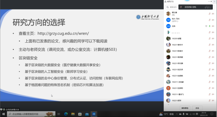 2023年1月9日晚,为了让同学们尽快熟悉信息安全专业情况,融入到信安大家庭,米乐M6体育app下载手机版 信息安全专业2021级师生新春见面会暨“1111”人才培养计划发布会通过腾讯会议在线上顺利举办。M6体育 党委副书记傅苑、M6体育 信息安全系全体教师、M6体育 信息安全专业2021级全体同学和2021级辅导员谭文博参加本次会议,会议由信息安全系党支部书记马钊老师主持。