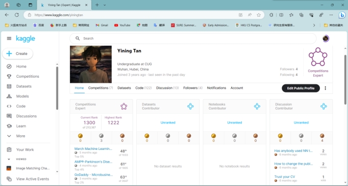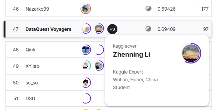 五场比赛历时3个月,分别吸引了来自全球多个国家的494支队伍,954支队伍,3547支队伍,1805支队伍和1033支队伍报名参加。经过激烈的角逐,来自我校的李桢宁同学在两场比赛中分别获得了铜牌(前19%)和银牌(前5%),SatoshiShimomoto队伍在三场比赛中分别获得了三枚银牌(Top2%,Top4%,Top5%)。