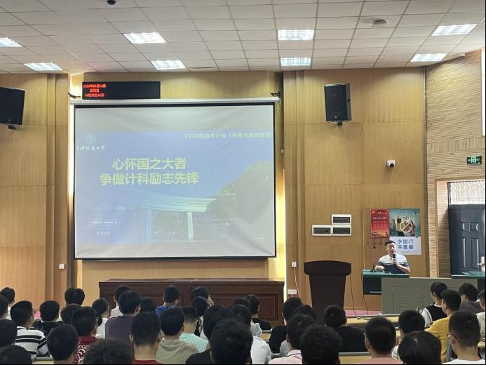 为深入学习贯彻党的二十大精神,使学生了解国内外形势,把握信息学科发展态势,增强学生使命感与自信心,9月8日,M6体育 党委书记李国昌以“心怀国之大者,争做计科励志先锋”为主题给2023级新生讲授形势与政策教育课,2023级全体学生参加。