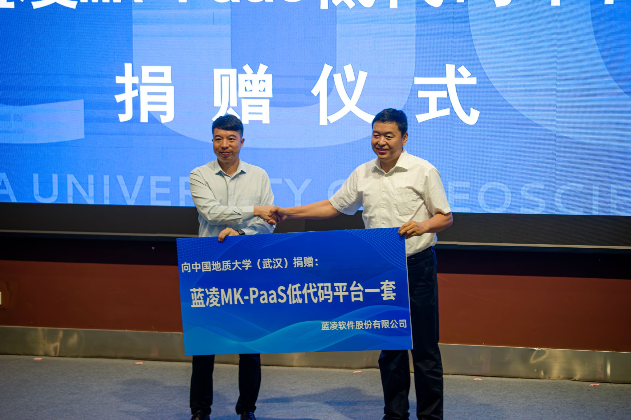 信息化办公室主任吴春明作为校方代表接收了蓝凌软件有限公司向学校捐赠的“蓝凌MK-PaaS低代码平台”。
