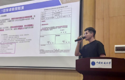 辅导员丁鑫磊老师就大学日常管理规范对同学们进行了专题教育,详细解读了学业管理规定、请销假流程制度以及人身与宿舍安全注意事项等内容,强调了遵守校规校纪的重要性。随后,他对学期末大一新生校区搬迁的具体安排和注意事项进行了部署与说明。最后,丁老师向同学们介绍了学校“一站式”师生服务大厅的功能、常用咨询服务电话及通勤车安排等信息,助力同学们提前了解未来城校园生活相关事宜。