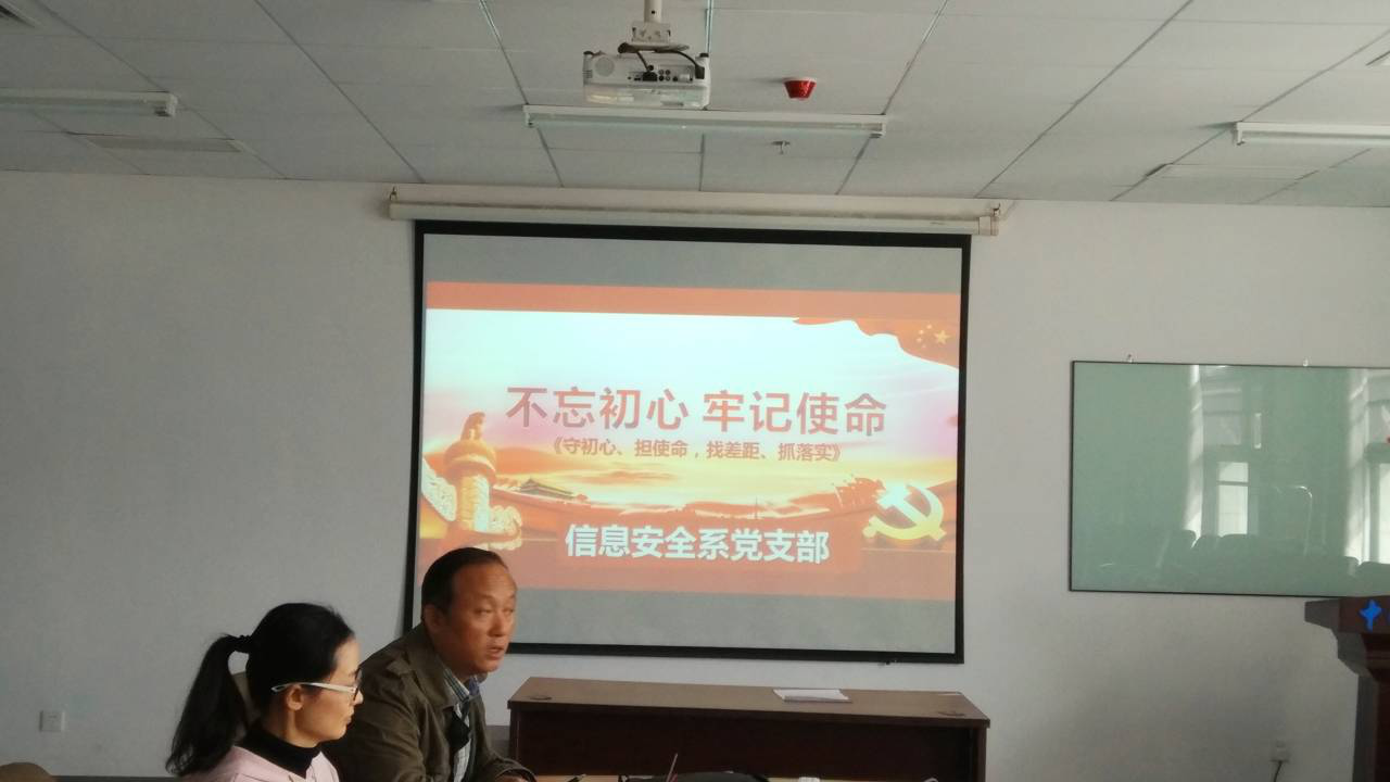 信息安全系支部宣传委员杨帆以“不忘初心,牢记使命”为主题召开一次专题组织生活会,带领大家学习了“不忘初心 牢记使命”主题教育的重大意义、总体要求、目标任务、重点措施和实践行动等五个部分,加深了对主题教育的理解及感悟,明确了主题教育的目标和举措。