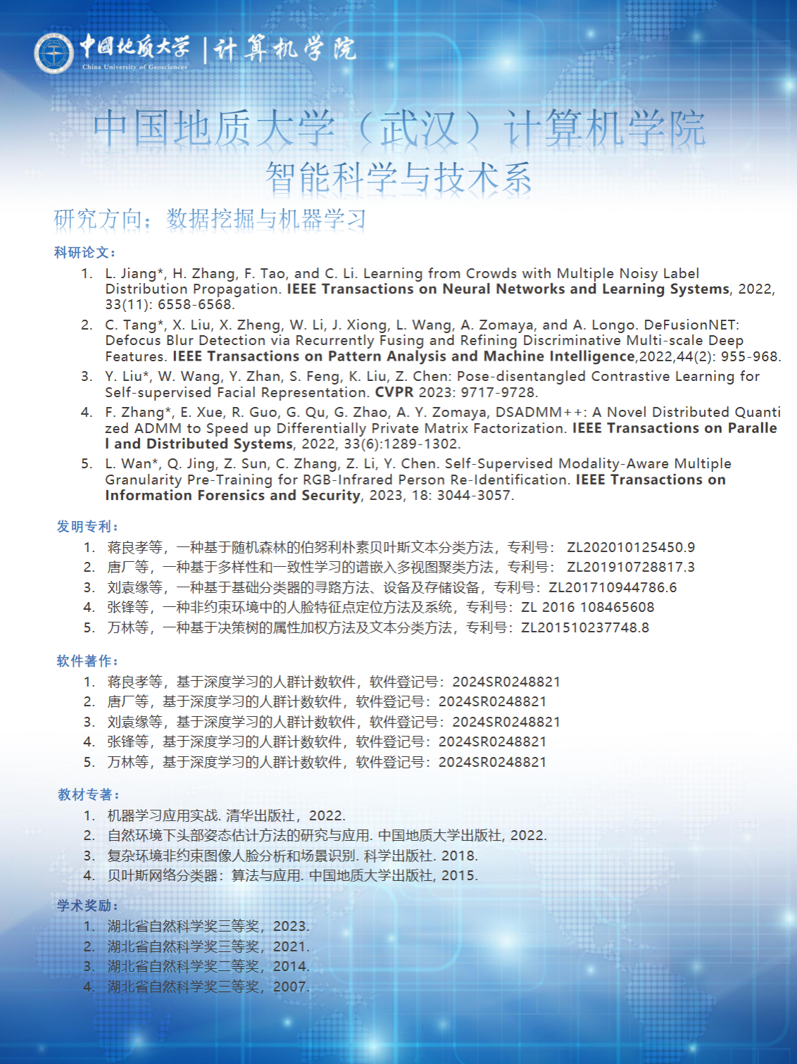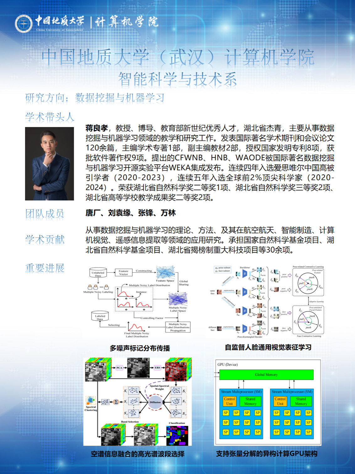 米乐M6体育app下载手机版 蒋良孝教授领导的团队在数据挖掘与机器学习理论及其应用研究领域连续获得国家自然科学基金项目、湖北省自然科学基金重点项目、湖北省揭榜制重大科技项目等资助,自主研发数据挖掘与机器学习系列理论及其应用创新成果,在著名学术刊物及国际会议上发表论文300余篇,拥有发明专利30余项,软件著作权20余项,出版教材专著4部,荣获湖北省自然科学奖二等奖等7项奖励。