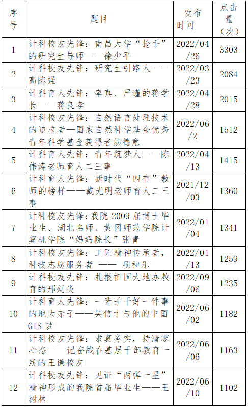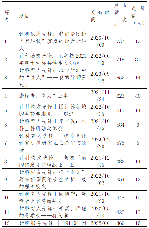 表一:M6体育 官网部分“计科先锋”事迹点击量统计表