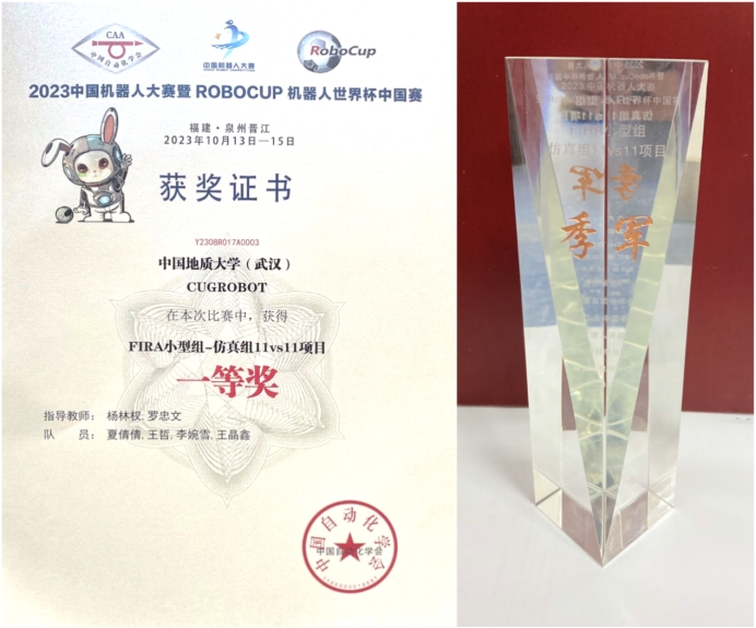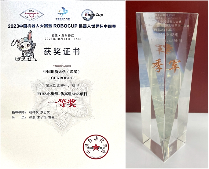 2023年中国机器人大赛暨RoboCup机器人世界杯中国赛(以下简称:中国机器人大赛)落下帷幕,M6体育 CUGROBOT代表队参加。经过激烈角逐,杨林权、罗忠文两位老师带领研究生张翡、夏倩倩和本科生朱子恒、王哲、曾馨、李婉雪、王晶鑫获得FIRA仿真组5vs5项目季军、一等奖,FIRA仿真组11vs11项目季军、一等奖。比赛过程历历在目,记忆犹新。