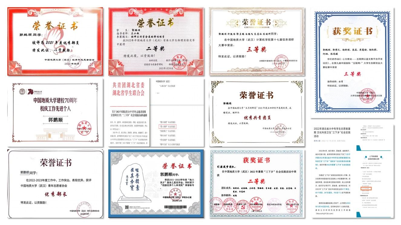 2023年6月,中国地质大学70周年校庆表彰大会召开,郭鹏顺荣获中国地质大学建校70周年校庆工作先进个人荣誉称号,在更大的志愿服务舞台上,他的努力得到了认可与肯定。