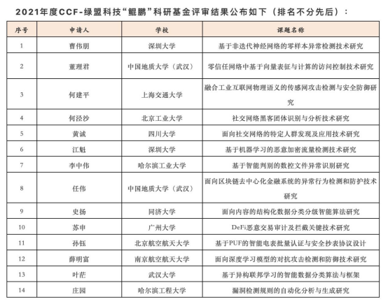 (通讯员:孙彦钦)近日,CCF-绿盟科技“鲲鹏”科研基金项目组根据课题申请方向,邀请了相关领域的专家,对课题的创新性、科学性、目标合理性等方面进行了综合性的评审,最终评选出14个项目获得“2021年度CCF-绿盟科技鲲鹏科研基金”资助,其中,米乐M6体育app下载手机版 任伟教授、董理君教授课题组喜获两项资助!