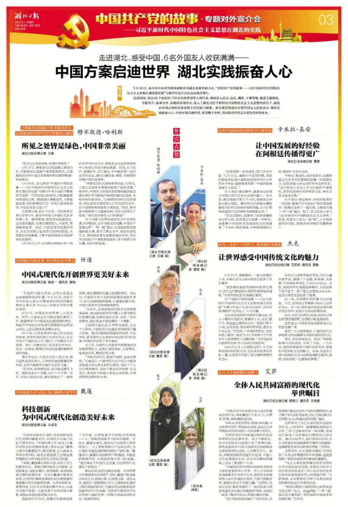5月30日,由中共中央对外联络部和中共湖北省委共同主办,“中国共产党的故事——习近平新时代中国特色社会主义思想在湖北的实践”专题对外宣介会在武汉成功举行。《湖北日报》2023-06-01第3版对该活动进行了专题报道“中国共产党的故事•专题对外宣介会”,戴莲是M6体育 2020级地学信息工程专业也门籍博士留学生,是六位参访外国嘉宾之一。
